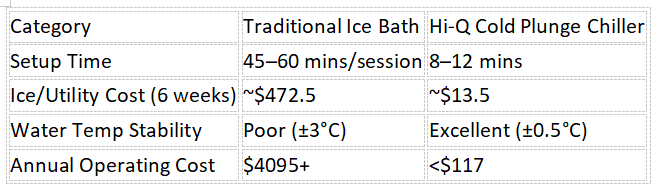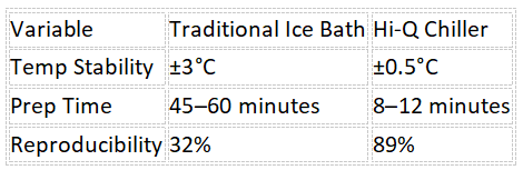 Izotz bainu tradizionalak vs Hi-Q sistemak:Izotz bainu tradizionalek tenperatura irregular zonak sortzen dituzte (azalera: 0 ° C; behealdea: 8 ° C), emaitza inkongruenteak sorrarazten ditu. Hi-Q-ren Vortex zirkulazioak uraren tenperatura homogeneoa bermatzen du, gaitzea:
